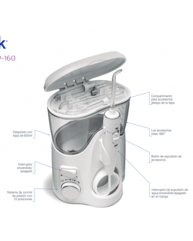 El Irrigador Waterpik® Ultra Plus WP-160 es un kit muy completo diseñado para eliminar de forma eficaz el biofilm oral de lugares de difícil acceso, así como de las coronas, puentes, retenedores e implantes.